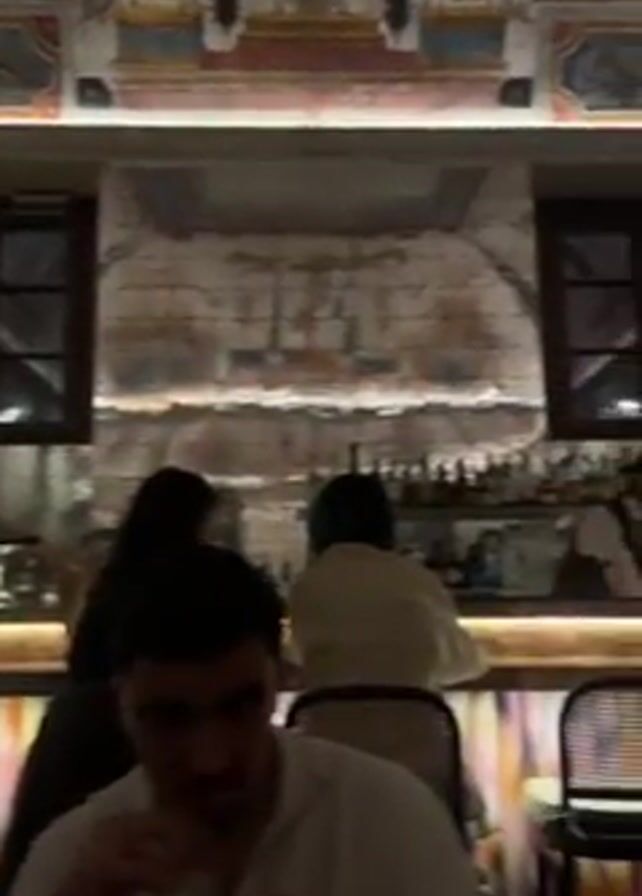 interior of a bar with a decorated ceiling and a few people. A person wearing a white shirt is sitting at a table in the foreground. Behind them, there is a bar where a bartender wearing a white shirt and black vest is working. There are other people sitting and standing at the bar. The ceiling is adorned with elaborate paintings and ornate designs. The overall atmosphere is dim and intimate. The camera pans upward to showcase the ceiling art in more detail.