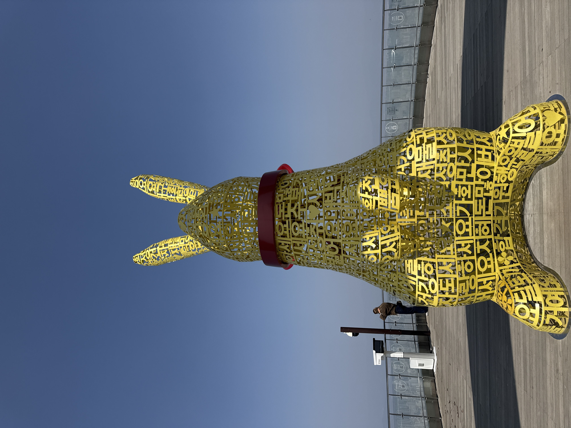A large, yellow rabbit sculpture, constructed from a lattice of Korean Hangul characters, stands centrally on a wooden observation deck at Apsan Park Observatory in Daegu, South Korea. The sculpture wears a red collar and is positioned with its back partially towards the camera. To the left, a solitary individual, dressed in a brown jacket and dark trousers, leans against a glass and metal railing, gazing towards a hazy distant horizon. Adjacent to the individual, a dark pole supports a white sensor-like device, and a white coin-operated viewer with visible QR codes is present. The wooden deck displays distinct shadows cast by the sculpture and railings under a clear blue sky.