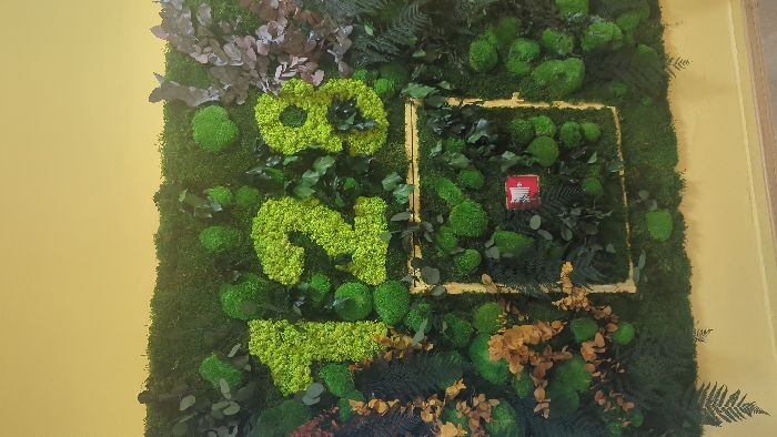 A vertically oriented image depicts a section of an indoor wall in Sofia, Bulgaria, specifically at the 128 SU Hristo Botev school. The wall is predominantly covered by a green, textured moss and plant installation. Central to the upper half of the display are the numbers "128," formed from a vibrant, light green, textured moss. The surrounding vertical garden incorporates various shades of green moss, including rounded clumps and flatter sections, interspersed with dark green fern fronds and smaller clusters of leafy foliage. Some foliage exhibits reddish-brown or dried characteristics. Below the moss numbers, a thin, gold-colored rectangular frame is embedded within the green wall. Inside this frame, towards the bottom left, a small, red rectangular plaque with a white stylized emblem, resembling a building with a flag, is visible. The moss installation terminates above a plain yellow wall surface, which extends downwards to an indiscernible floor line. No individuals or active subjects are present in the scene.