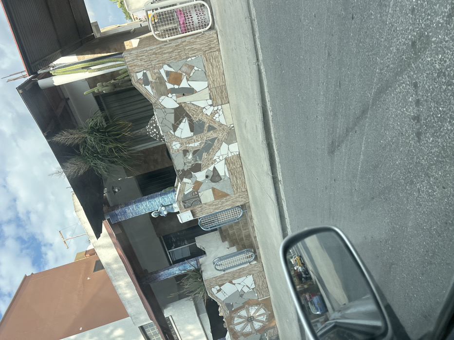 This image captures a daytime residential street scene in Limassol, Cyprus, specifically at 2 Agias Mavris. The perspective is from a vehicle, with the passenger-side rearview mirror prominently displayed in the lower-left quadrant, reflecting parked vehicles on a street behind the viewer. The foreground consists of a dark grey asphalt road surface. The midground showcases the front of a house, set back from the road by a sidewalk and a distinctive mosaic perimeter wall. This low wall is constructed from irregularly shaped tiles in various shades of brown, beige, grey, and white. Integrated into the mosaic are a large ship's wheel design on the left section and a large anchor design on the right. Two narrow, vertical metal grates, resembling gates with an oval pattern, flank a short flight of tiled steps leading up to a covered porch. The porch features a corrugated metal roof supported by pillars, one of which (on the left) is adorned with blue and white mosaic tiles. A single light fixture hangs from the porch ceiling. A white, bare-chested female statue stands on a pedestal near the left pillar, facing right. Below it, a white post-mounted mailbox is visible. A large, multi-stemmed plant with long, spiky leaves and prominent feathery inflorescences is centrally placed on the porch, resting on a large, white, mushroom-shaped decorative object with dark spots. A tall, slender cactus plant stands upright to the right of the porch structure. The house itself has large windows or glass sliding doors, partially obscured by light-colored curtains. In the background, a two-story building painted in a terracotta or orange-brown color is partially visible to the upper left, adjacent to the main house. The sky is blue with scattered white cumulus clouds, and overhead utility lines with poles are discernible. No individuals are present in the immediate scene or clearly identifiable in the mirror's reflection.