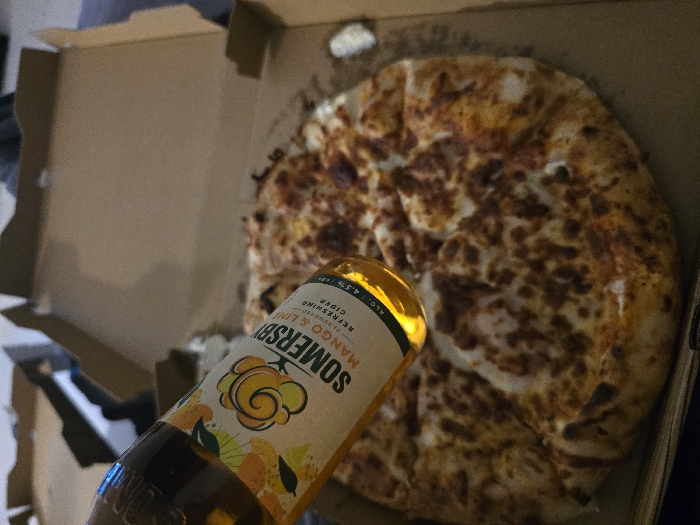 An open, square, light brown cardboard pizza box contains a round, cut pizza with cheese and dark brown toppings, exhibiting some charred areas. A clear glass bottle of Somersby Mango & Lime flavored refreshing cider, bearing a yellow label with fruit imagery and "ALC. 4.5%" visible, is positioned diagonally across the pizza within the box. The background is indistinct, suggesting an indoor setting. The specific location within the city of Pleven, Bulgaria, cannot be determined from the provided image.