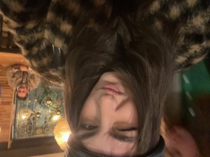 An upside-down selfie shows a woman with long brown hair and a leather collar, wearing a fur-like patterned coat. She is squinting with a neutral expression. In the background, a man sits at a table, looking towards the camera, dressed in a tan jacket. Behind him is a decorated wall with illuminated orbs and geometric designs. A green object is to the right of the woman.