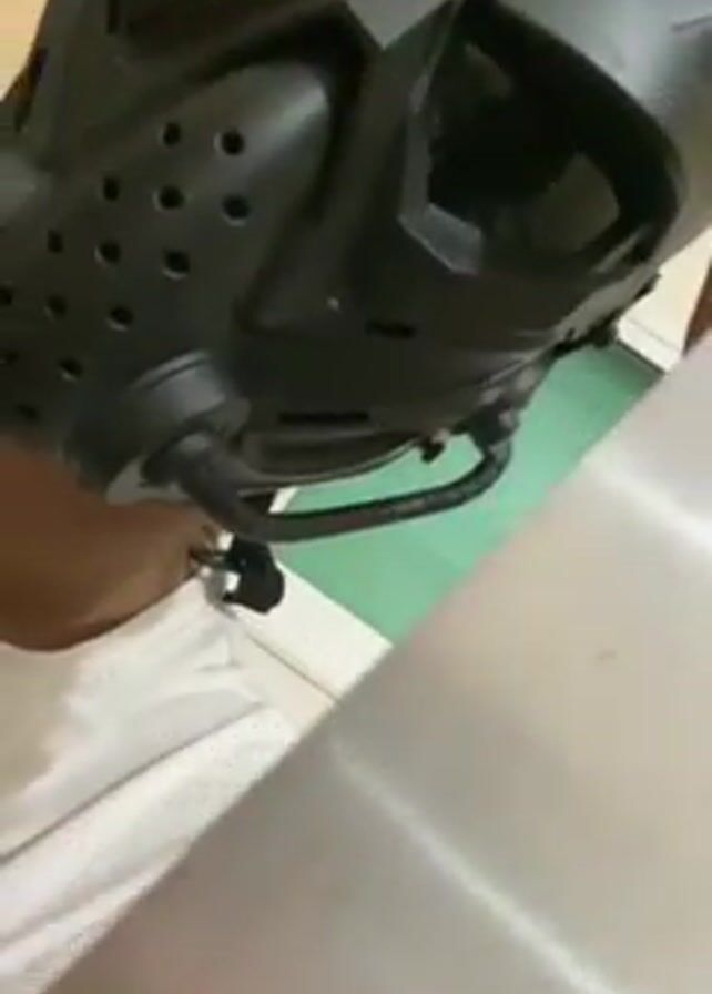 A person wearing a black futuristic mask with visible tubing and vents is holding a long, silver blade. The person is wearing white clothing, possibly in a bedroom or indoor space based on the presence of a window and what appears to be bedding. The room becomes dark briefly.
