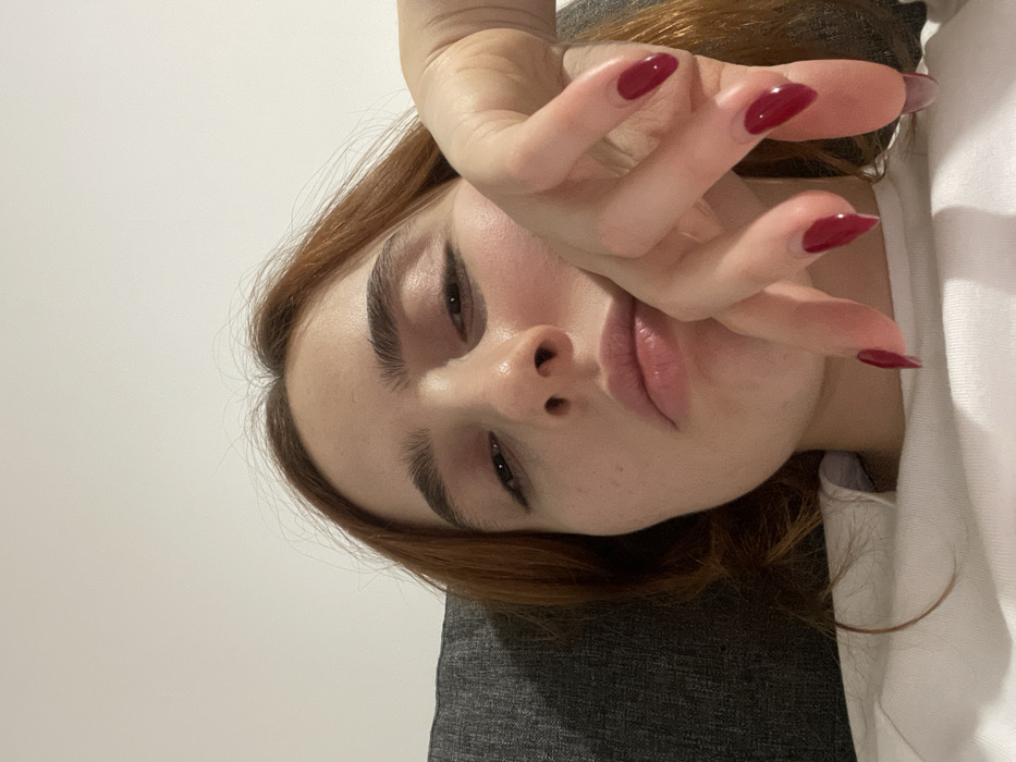 An individual, identified as female, is depicted in a close-up, upward-angled shot. She possesses reddish-brown hair and a fair complexion. Her eyes are partially open, directed towards the camera, with a neutral expression. Her left hand is raised to the left side of her face, with fingers loosely curled and resting against her cheek and jawline. The fingernails on her visible hand are painted a deep red color and feature an elongated, pointed shape. She is wearing a white t-shirt, visible on her upper chest and shoulder. The background consists of a dark grey, textured surface on the left, possibly upholstery, and a plain, light off-white wall covering the rest of the visible area. The setting is an indoor, generic environment, providing no visual cues to confirm a specific location within the city of Reims, France.