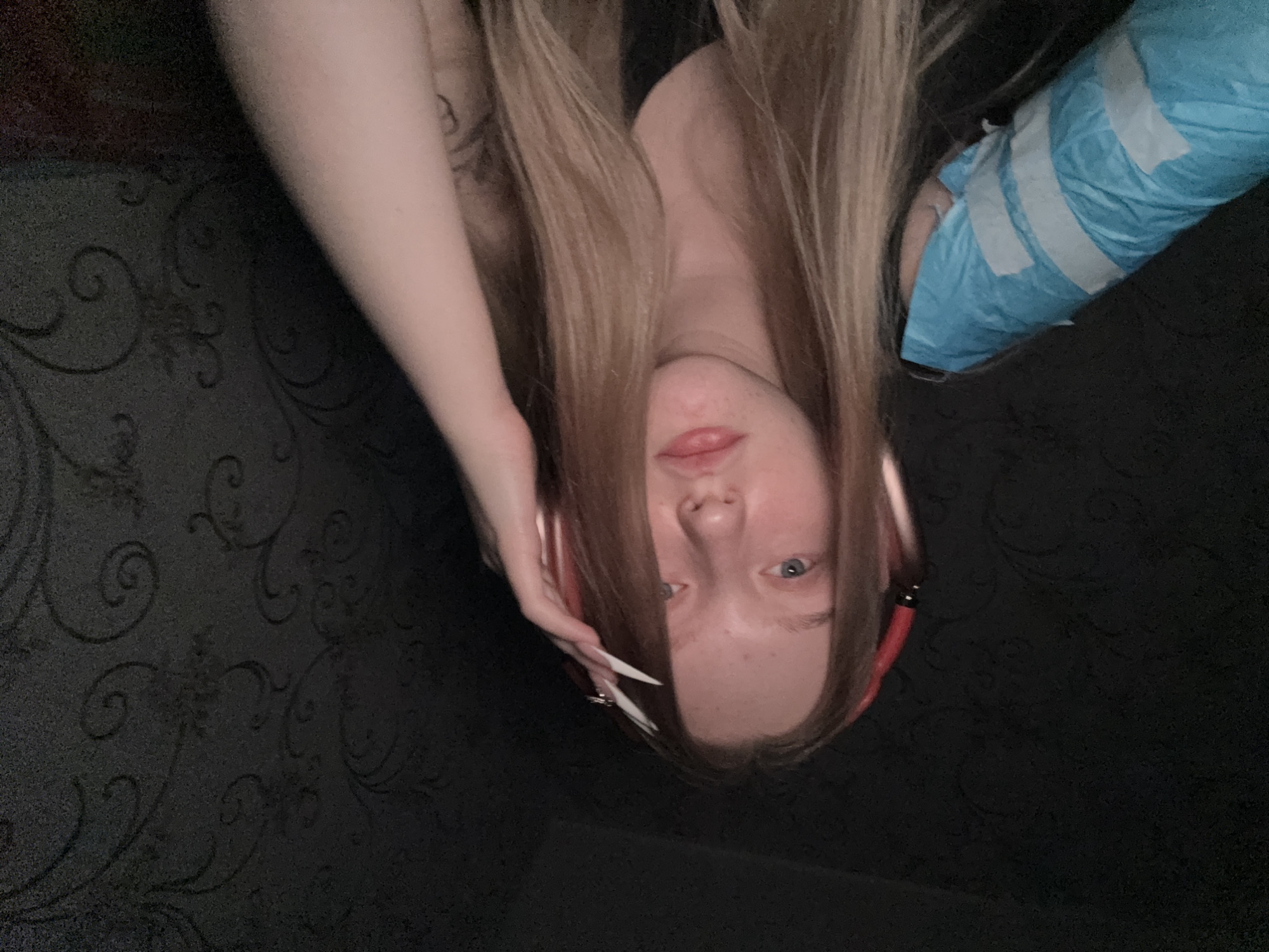A young fair-skinned woman with long blonde hair is positioned upside down, her head in the lower center of the frame