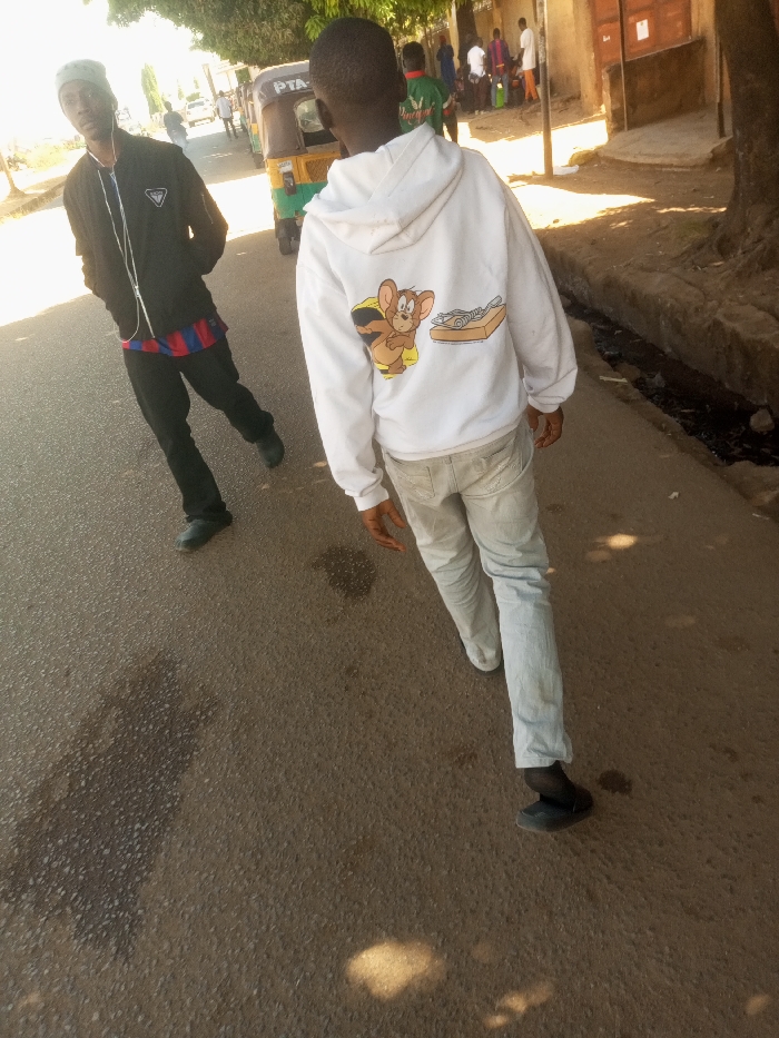 The image captures a street scene in Bukuru, Nigeria, during daylight hours. Two male individuals are prominently featured, with additional people and a vehicle in the background. In the immediate foreground, a male, seen from behind, walks towards the right. He is wearing a white hooded sweatshirt featuring a graphic on the back depicting the cartoon character Jerry holding a piece of cheese next to a mousetrap, and light-colored jeans. Dark-colored slip-on footwear is visible on his feet. Further back and to the left, a second male subject walks towards the camera. He wears a dark zippered jacket over a shirt with horizontal red and blue stripes, dark pants, and dark shoes. A light-colored cap covers his head, and white earbuds are visible. A yellow and green three-wheeled auto-rickshaw, marked with "PTA" on its side, is positioned on the asphalt road in the midground, between the two primary subjects. Several indistinct individuals are visible walking or standing further down the street on the right side. The environment consists of a paved asphalt road exhibiting patches of discoloration. A concrete curb delineates the road from an unpaved area on the right, where an open drainage ditch containing dark liquid and debris is present. A large tree trunk is visible on the far right, casting shadows. Light-colored buildings are visible in the background. Strong shadows on the ground indicate direct sunlight.