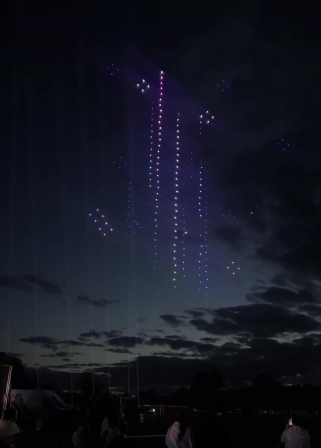 nighttime drone show. Numerous drones are visible in the dark sky, arranged in formations of vertical lines and other patterns, creating an illuminated display. There is a crowd of people on the ground watching the show. Some of them are holding up their phones, seemingly to record or photograph the event. The background includes a few structures, trees, and a slightly cloudy sky along the horizon. The overall scene appears to be an outdoor event at dusk or night.