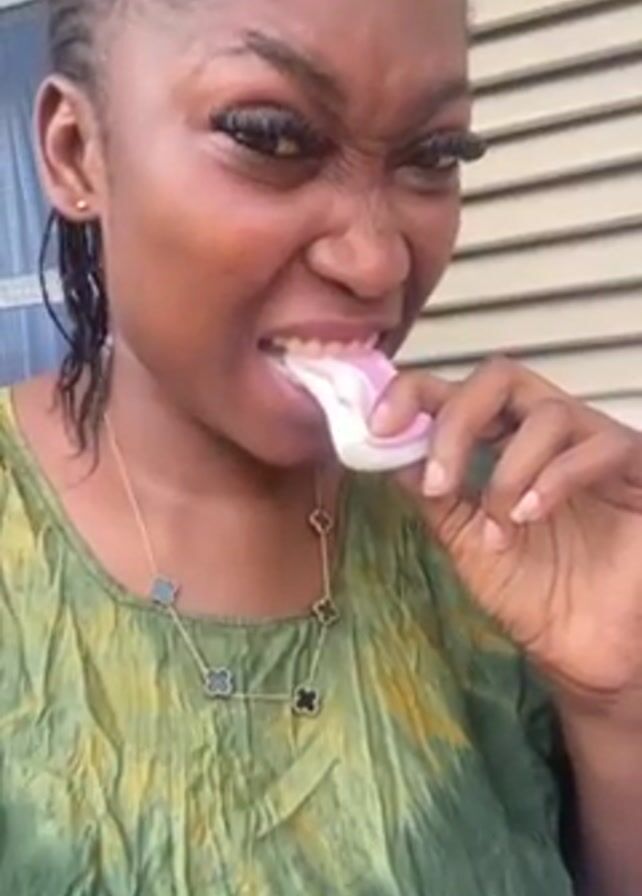 A medium shot shows a woman using a teeth whitening device in her mouth. The woman has dark skin and dark, braided hair that is pulled back from her face. She is wearing a green and yellow tie-dye shirt and a gold necklace with black clover-shaped pendants. She is facing the camera with a slight grimace. The whitening device is pink and white and is held in her mouth by her bite. The background is a beige, horizontal-slatted wall with a hint of a blue screen door visible.