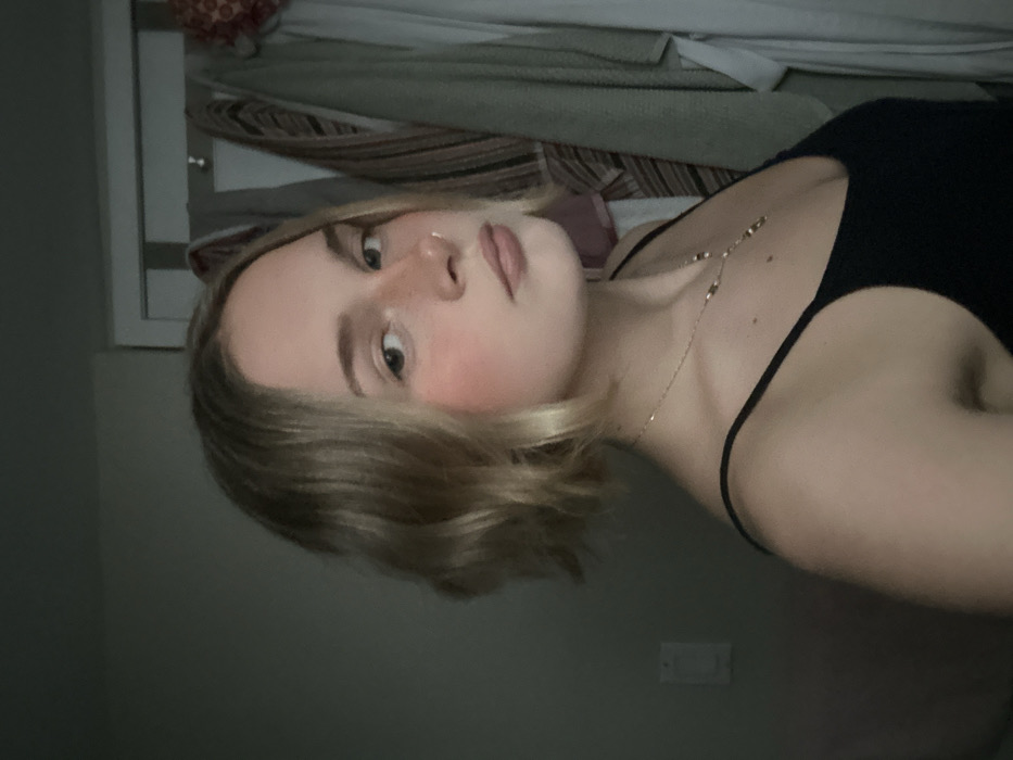 An indoor scene, specifically a residential room such as a bedroom or dressing area, is depicted within the city of Vancouver, Canada. The primary subject is a young female, positioned with her body slightly angled left and her head turned to face the camera directly. She has shoulder-length wavy blonde hair, fair skin with noticeable freckles across her nose and cheeks, and rosy blush on her cheekbones. A small, metallic ring pierces her right nostril. She wears a black spaghetti strap top and a delicate gold-toned necklace adorned with small, elongated beads or charms. The background on the left consists of a plain, light grey wall featuring a vertically oriented white rectangular light switch or power outlet. To the right, a light-colored doorframe is visible, beyond which various garments or textiles hang on a rack or hooks, displaying patterns including stripes and solid colors. The scene is illuminated by soft, ambient lighting.