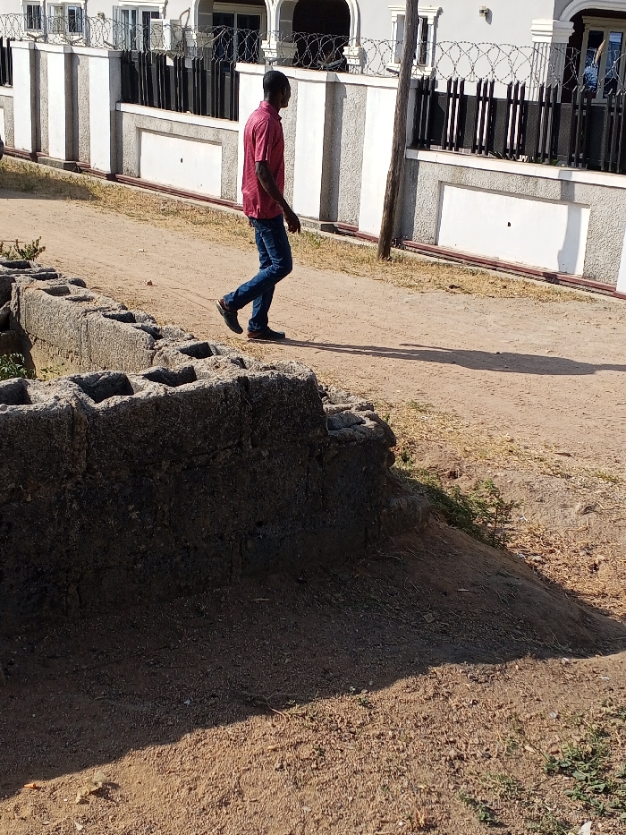 This image depicts an outdoor scene in Adonkolo, Nigeria, under bright daylight. An adult male, with a dark complexion, short dark hair, wearing a red short-sleeved collared shirt, dark blue jeans, and dark shoes, is observed walking from left to right across a dirt road or path. He is captured mid-stride, with his left leg forward. His shadow extends diagonally behind him on the dusty, light brown ground. In the foreground, to the left, is a weathered, low structure constructed from grey concrete blocks, exhibiting visible rectangular voids. Sparse patches of dry grass and small green vegetation are visible on the ground, particularly along the edges of the path and surrounding the concrete structure. In the background, a light-colored building or perimeter wall extends horizontally across the frame. This wall features vertical dark grey or black decorative elements and is topped with coiled barbed wire or razor wire fencing. A wooden utility pole stands vertically in the mid-background, casting a long shadow to its right. Architectural elements with arched designs are visible above the wall, suggesting a more elaborate building structure behind it.