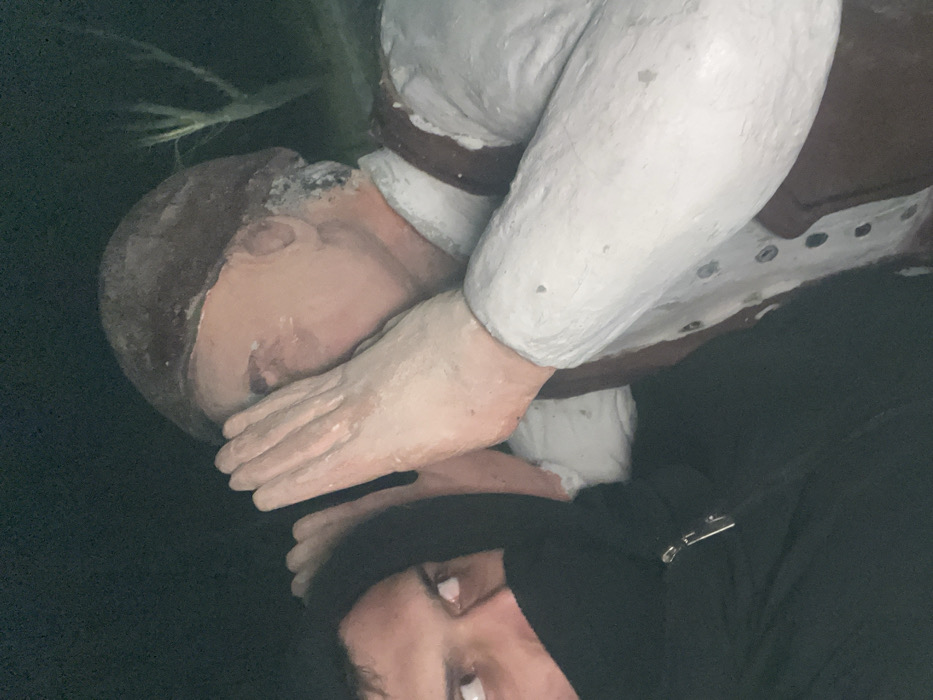 The image depicts a close-up, dimly lit outdoor scene in the city of Rakovski, Bulgaria. On the left, a human individual is partially visible from the chest up, with only their eyes and forehead exposed. The lower half of their face is obscured by the black fabric of a hooded jacket, which features a visible silver zipper pull on the right side. Their eyes are wide open, gazing upwards and slightly to the right. To the right of the individual is a painted statue depicting an adult male. The statue wears a brown cap, a white long-sleeved shirt, and a brown vest. Its right hand is raised, cupping its mouth and directed towards the human individual, in a gesture suggesting whispering. The statue's eyes are closed. The background is predominantly dark, with a faint, blurry outline of a bare tree visible in the upper right quadrant, illuminated by an unseen light source.