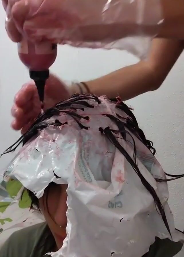 In a close-up shot, a person with dark hair is having their hair dyed a pink color. The person is wearing a torn plastic bag over their head, with strands of dark hair pulled through the holes. A second person, wearing clear plastic gloves, is applying the pink dye from a bottle with a nozzle. The dye appears to be a vibrant pink, contrasting with the dark hair. The person receiving the dye has a nose piercing. The background is a plain white wall. The overall scene suggests a DIY hair dyeing process taking place in a home setting.