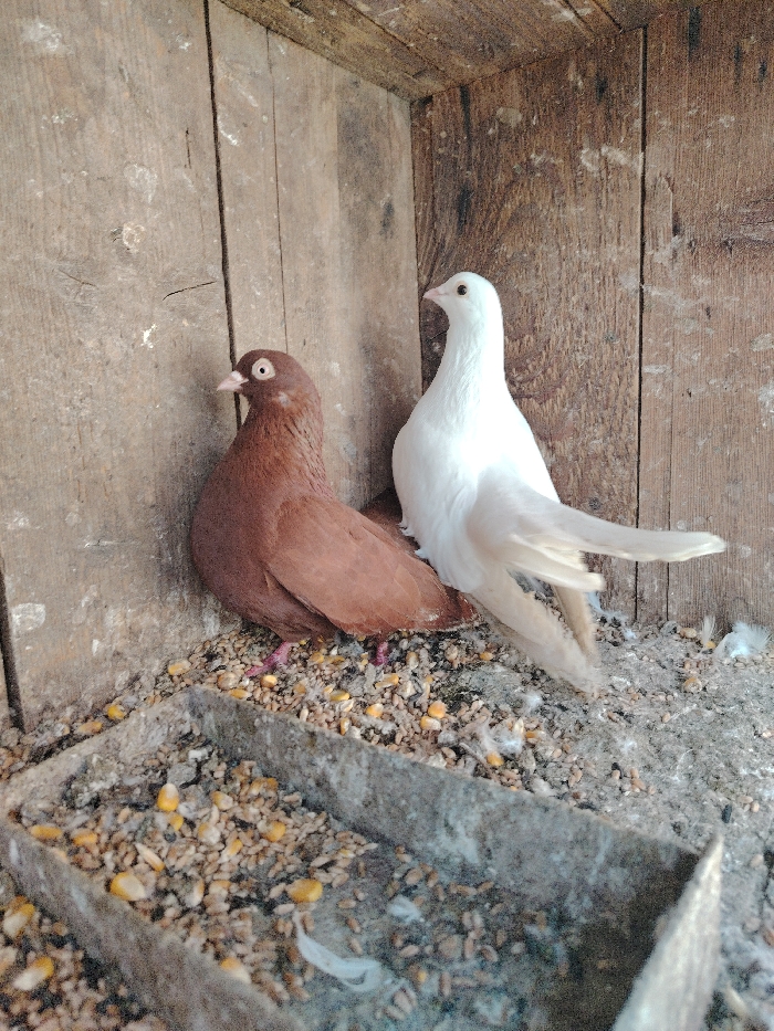 This image depicts the interior of a rustic wooden enclosure, identified as being located in Drianovo, Bulgaria. Two pigeons are the primary subjects. On the left, a reddish-brown pigeon stands facing left, exhibiting a light-colored ring around its eye. To its right, a pure white pigeon stands, also facing left, with a light eye. Both pigeons are positioned on a floor covered with a scattered mixture of small grains and yellow corn kernels, interspersed with white feathers and dark debris. In the immediate foreground, a grey, rough-textured, trough-style feeder is visible, partially filled with the same mixed grain and corn. The background consists of vertical, weathered wooden planks forming the corner of the enclosure, showing natural grain patterns and scattered white marks, likely bird droppings. The environment appears functional for housing pigeons.