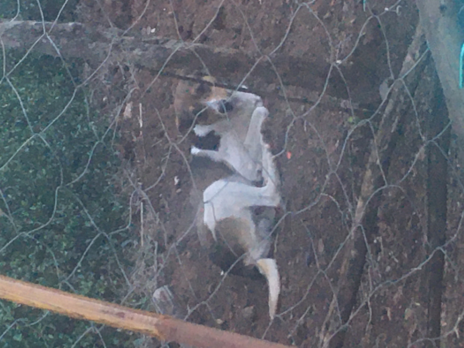 A tan and white squirrel is entangled in a wire fence. It appears to be on the ground, positioned vertically. The squirrel's arms are outstretched towards the wire mesh. The backdrop is a mix of brown dirt and greenery. A brown object, possibly a piece of wood, lies in the foreground. The photograph is partially obscured by the fence and has a slightly blurry quality.
