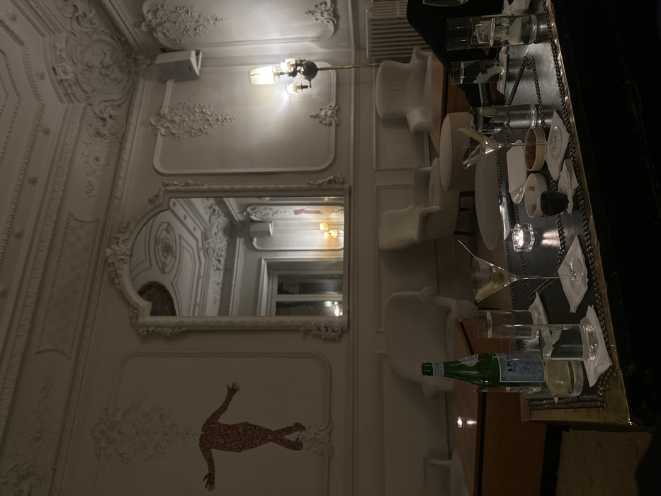 A sideways view captures a luxurious restaurant interior. The ornate, white walls are adorned with intricate moldings and a large mirror reflecting a continuation of the elaborate design. A stylized, red figure appears to float near the bottom of the wall. A sleek, black bar is lined with white chairs and set with glassware, plates, and a bottle of San Pellegrino. The composition evokes an atmosphere of elegance and artistic flair.