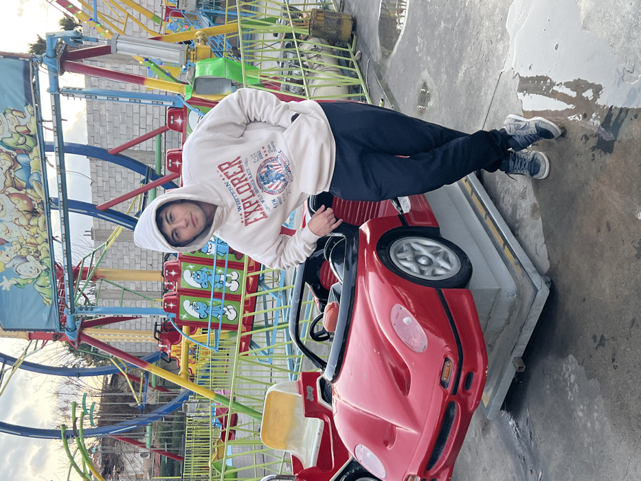 An outdoor scene in Barza Municipality, Syria, captures a young adult male posing in an amusement park setting