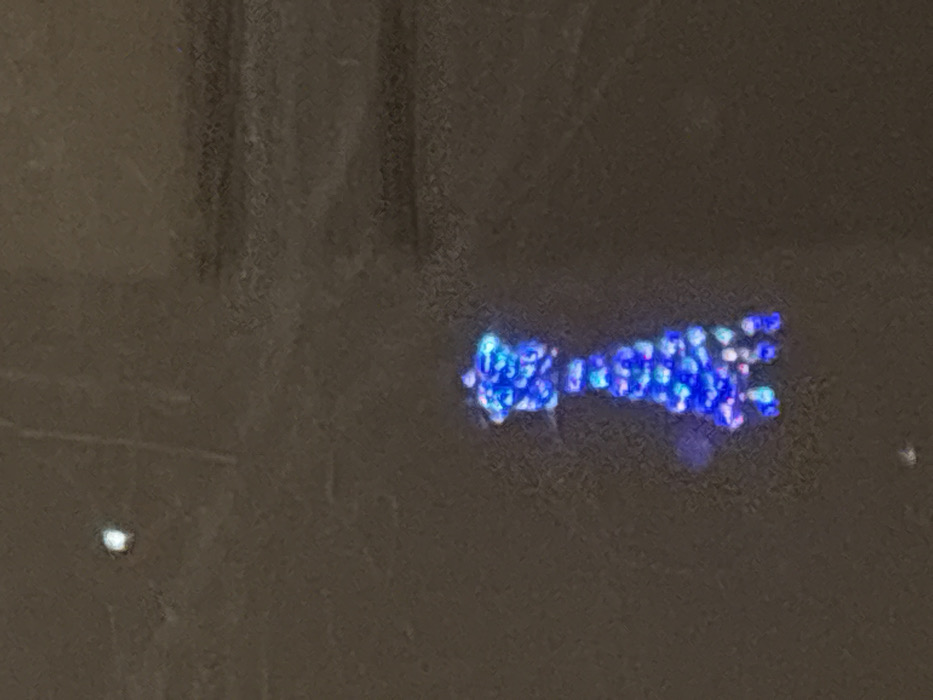 A blurry, illuminated object is centered on a dark, grainy background. The object has a rounded, dense cluster of bright blue points on one end, tapering into a narrower line of similar points extending to the right. At the far right end, there are a few separate bright points that give the impression of extremities.