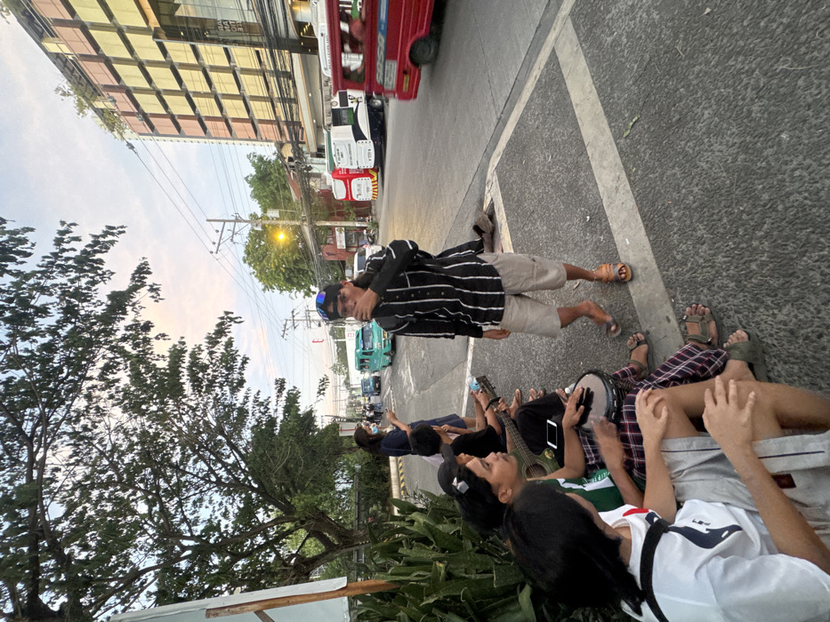 The image depicts an urban street scene in Davao City, Philippines, during late afternoon or early evening, characterized by a light blue sky with faint pink and orange hues. In the foreground, a group of five individuals is situated on the sidewalk. Four are seated on a low concrete barrier or curb on the left. The person closest to the viewer, with dark hair and a white and green shirt, is partially obscured. Next to them, a male with dark hair and a green shirt, wearing plaid pants and sandals, is seated, playing a small drum (djembe). To his right, another male with dark hair, wearing a black cap and dark shirt, holds a ukulele, with a smartphone resting on his lap. Further behind them, a fourth seated person is partially visible. Standing centrally on the sidewalk, slightly to the right of the seated group, is a male wearing a black and white vertical striped long-sleeved shirt, beige shorts, and brown sandals. He has a dark cap with reflective sunglasses pushed up on his head and is covering his mouth with his left hand. Further down the sidewalk, a woman in a dark top and blue skirt, wearing a face mask, stands looking at her phone. The street, made of asphalt with white markings, runs from the foreground to the background. Traffic includes a red jeepney moving from left to right on the right side of the road, and a white modern bus or truck with red accents parked on the far side. A green jeepney is visible further down the street, moving from right to left. On the right side of the road, a multi-story modern commercial building with a distinctive gold and orange grid-patterned facade is prominent. Partial signage on the building appears to read "GRAND [partially obscured] AVENUE COMMERCIAL CENTER." Utility poles with numerous power lines crisscross the sky above the street. Large trees with dense green foliage are visible on the left side, behind the sidewalk.