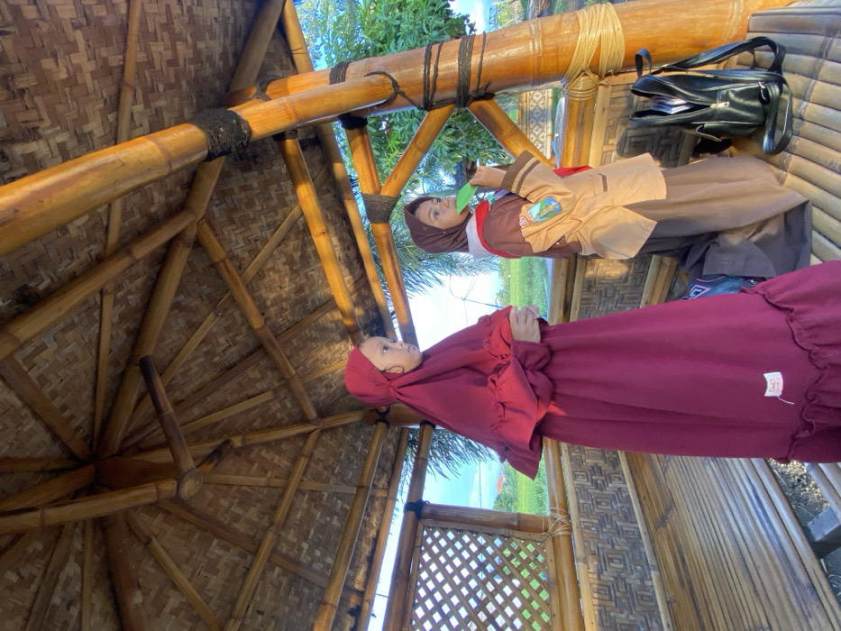 Two young females are depicted standing within an open-sided bamboo structure in Kalitengah, Indonesia. The structure features an octagonal, woven bamboo roof supported by thick, varnished bamboo beams secured with dark rope bindings. Woven bamboo lattice constitutes the back wall and bench seating. On the left, a young girl, facing slightly right, wears a floor-length, long-sleeved maroon garment with ruffled cuffs and hem, and a matching maroon head covering. A small white label with red text is attached to the lower front of her dress. Her hands are held together at waist level. To her right, a second young girl, facing slightly left, wears a light brown, long-sleeved uniform top with a brown long skirt, a brown head covering, and a red neckerchief. A multi-colored emblem is visible on her right upper arm. She is consuming a green popsicle. A black backpack with open compartments rests on the bamboo bench beside her. Beyond the bamboo structure, lush green vegetation and a bright sky are visible, indicating an outdoor setting.