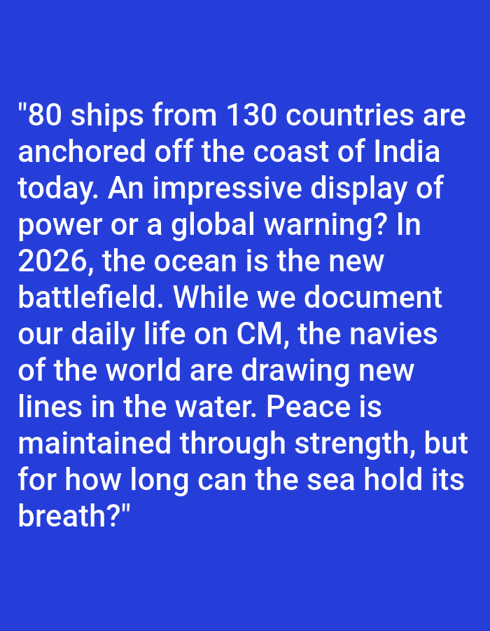 The image displays white sans-serif text against a solid royal blue background. The text content states, "80 ships from 130 countries are anchored off the coast of India today. An impressive display of power or a global warning? In 2026, the ocean is the new battlefield. While we document our daily life on CM, the navies of the world are drawing new lines in the water. Peace is maintained through strength, but for how long can the sea hold its breath?" No physical location within a city of Unknown, Unknown, is depicted, as the image consists entirely of this textual graphic. No people, objects (other than text characters), or actions are visually present; the scene is a digital representation of written information.