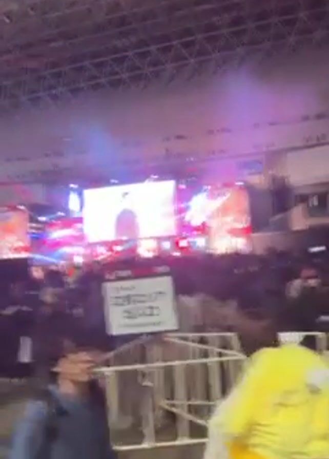 large indoor convention space with a stage and a large screen in the distance. A crowd of people is gathered in front of the stage, watching a performance or presentation on the screen. The screen displays a person speaking. There are stage lights of various colors illuminating the scene. A person in a yellow costume with a large, cartoonish head is walking in the foreground. There are metal crowd control barriers nearby. A sign in Japanese indicates "Standing Area Entrance/Exit." The convention space has a high, exposed ceiling structure with crisscrossing beams. The atmosphere suggests a lively, crowded event.