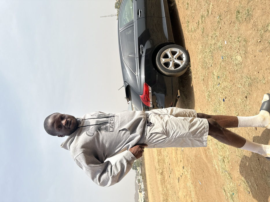 The scene depicts an outdoor setting on unpaved, dry ground within the city of Jos, Nigeria, under a hazy, light blue sky. A male individual, appearing to be of African descent, stands in the foreground, slightly to the left of center, facing the camera with direct eye contact. He is wearing a grey hooded sweatshirt with a black drawstring and a "NA LACROSSE" graphic on the chest, light grey shorts, white athletic socks, and dark slide sandals. His right hand is positioned in his right pocket, and his left hand rests near his left hip. In the midground to the right, a black Toyota Venza crossover vehicle is parked, oriented with its rear towards the viewer. Distant, low-rise buildings are visible on the left side of the background, and a tall metallic transmission tower stands further right in the distance. The ground consists of reddish-brown earth with sparse dry grass patches and scattered small pieces of debris.