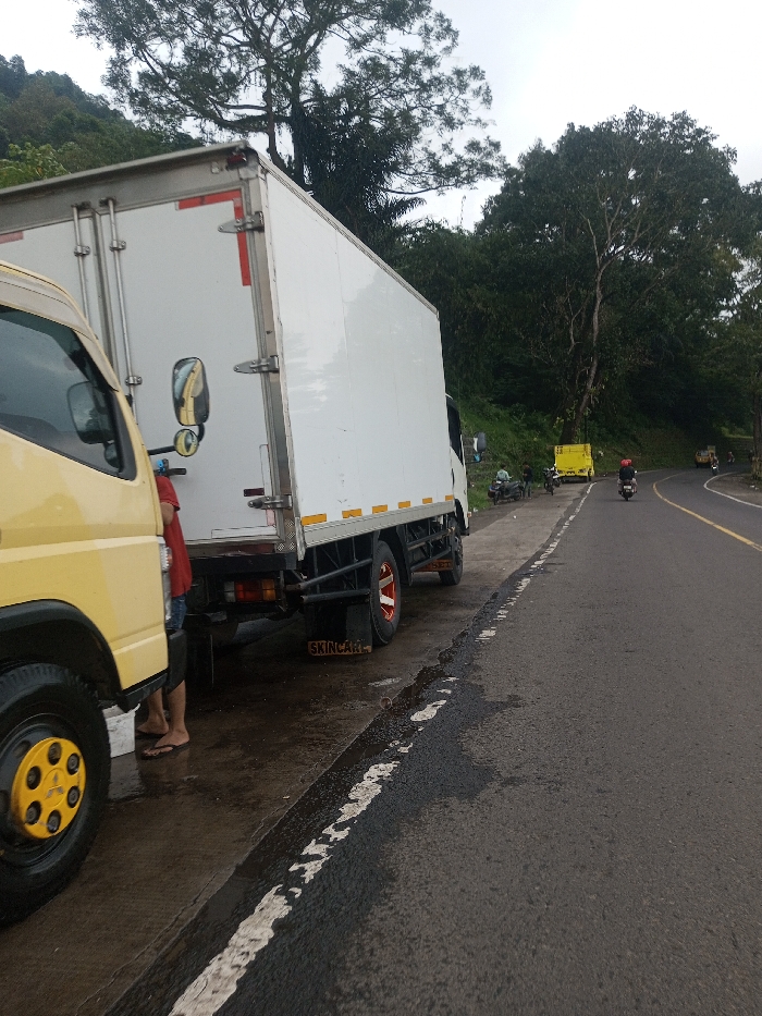 The scene depicts a roadside area in Sandamal Eliya, Sri Lanka, under an overcast sky. In the foreground, the front-left portion of a yellow truck is visible, parked on a wet asphalt shoulder. Adjacent to it, a white box truck is stationary, displaying orange wheel hubs and "SKINCARE" text on its mud flaps. A person wearing a red shirt, dark shorts, and flip-flops stands between these two trucks, partially obscured. The paved road, marked by a solid white edge line, curves right into the distance. The right side of the road is bordered by dense green trees and vegetation covering a hillside. Further down the road, several motorcycles are parked on the shoulder near a small yellow utility vehicle. A single individual on a red motorcycle is observed traveling away from the viewer on the road, with another vehicle visible in the distant curve.