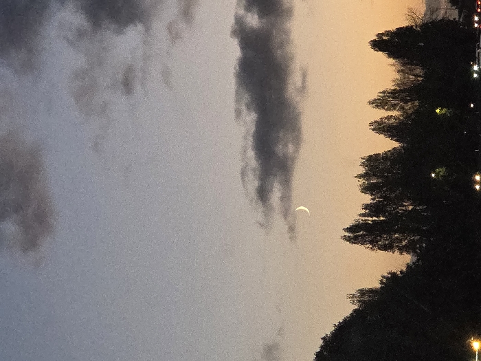 The image depicts an outdoor scene at twilight over Hérouville-Saint-Clair, France. The sky, occupying the upper two-thirds of the frame, transitions in color from a dark blue-grey at the top to a muted orange-peach hue near the horizon. Scattered dark grey clouds are visible, with a denser cluster in the upper right quadrant. A distinct, slender crescent moon, illuminated on its right convex edge, is positioned in the upper-middle left portion of the sky. Below the horizon, the dark silhouettes of numerous tall, slender trees, consistent with poplars, form a jagged line across the midground. To the far left, a dense, dark mass of foliage suggests a wooded embankment or hillside. In the immediate foreground, at the very bottom of the frame, multiple blurred artificial light sources are visible. These lights, appearing as bright, diffused points and streaks, are consistent with streetlights or vehicle headlamps/taillamps on a road or in a parking area, indicating an active urban or suburban environment at the base of the tree line. No people or discernible actions are visible.