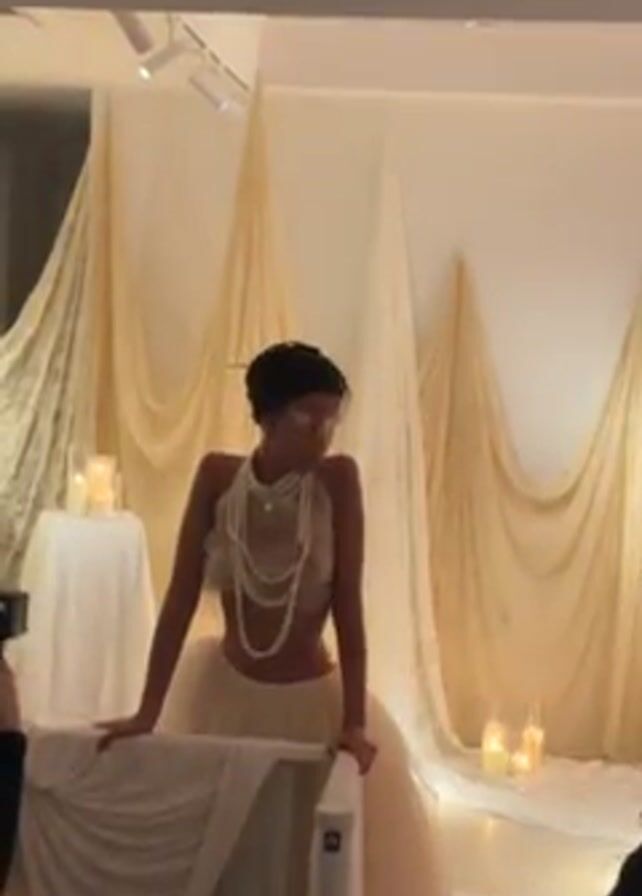 A low-angle shot shows a model posing in a room. She is a woman with dark skin and dark hair pulled up into a bun. She is wearing a light-colored two-piece dress, with a pearl necklace draped around her neck. She is resting her hands on a white, draped structure. Behind her are draped fabrics and candles, creating a soft, ethereal backdrop. The room is illuminated by overhead lights. Another model appears in the right frame. People are visible in the foreground, taking photos.