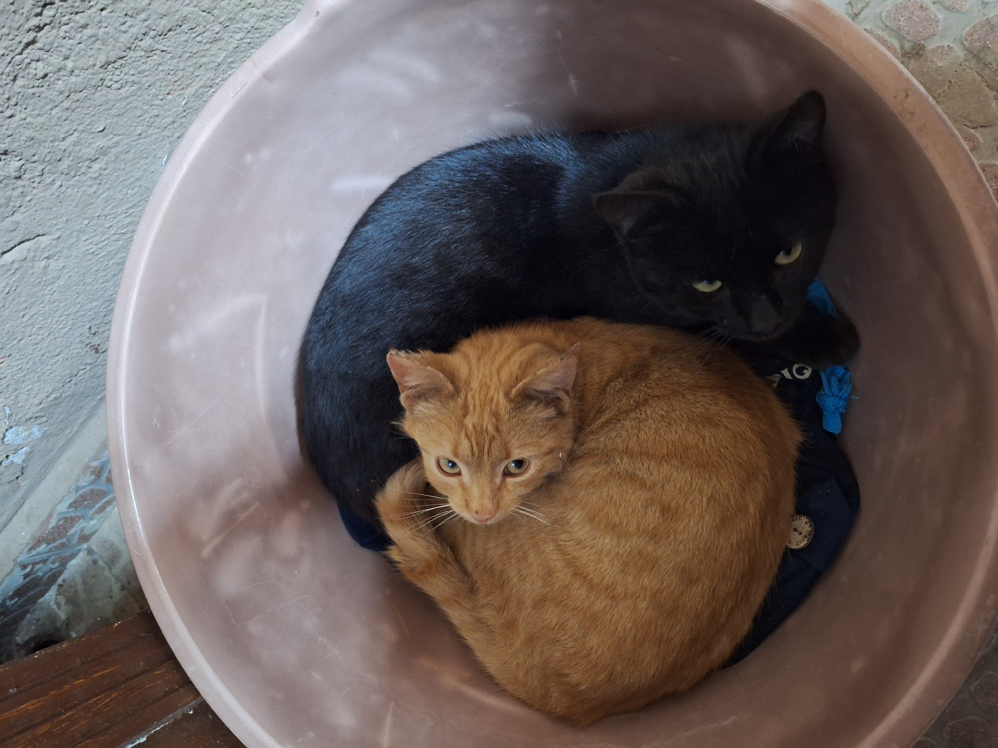- "Two domestic cats are observed resting inside a light brown, circular plastic basin" by FM-ZEYr12, licensed under CC BY 4.0