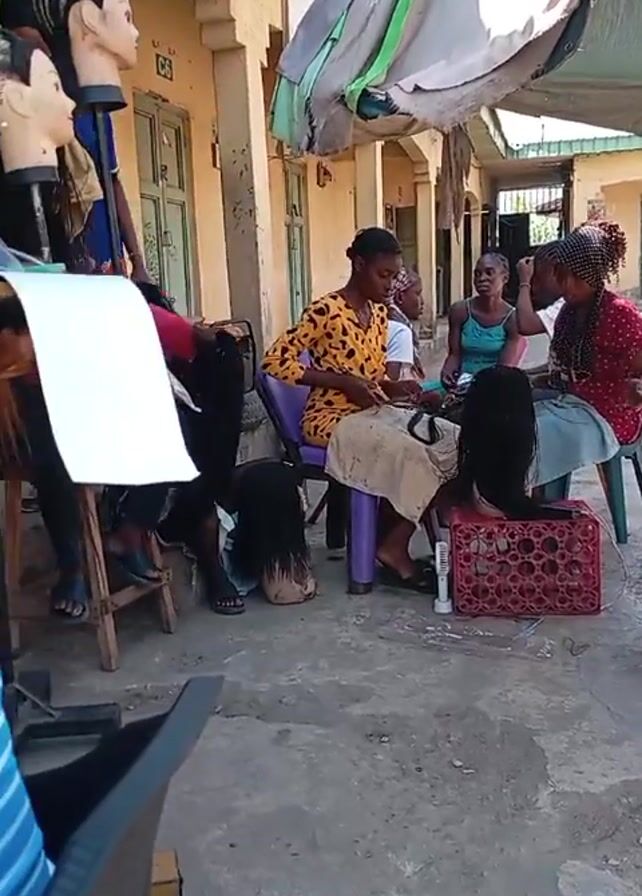 hair salon or hair braiding establishment that appears to be set up outdoors, possibly in a covered courtyard. Several women are seated in chairs, and some are working on hair braiding on mannequin heads or on other individuals. There are also a few women just sitting and talking. Various hair care products, tools, and accessories are visible, including hair extensions, spray bottles, combs, buckets, and mannequin heads with different hairstyles. The surrounding environment includes building facades, supports, and some overhead coverings, creating a makeshift workspace. Overall, the scene depicts a bustling atmosphere of hair braiding and styling in an outdoor setting.