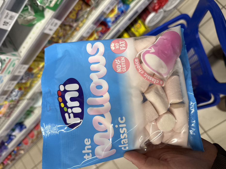 A hand holds a blue bag of Fini "the Mellows classic" marshmallows