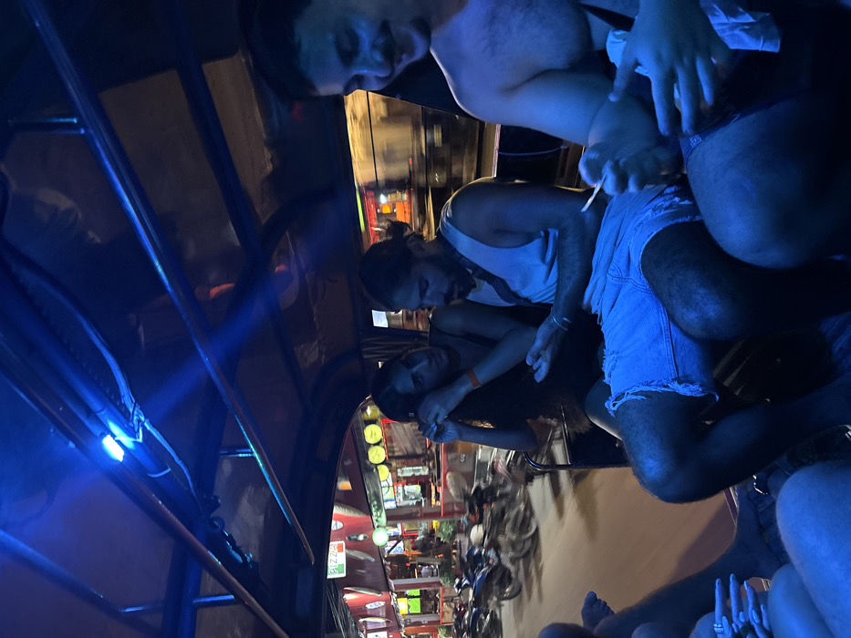 The image depicts the interior of a moving open-sided, covered passenger vehicle, likely a tuk-tuk, illuminated by overhead blue LED strip lights, on a commercial street at night in what is consistent with Moo 1, Thailand. Three individuals are prominently visible among multiple occupants. On the far right, a shirtless male with dark hair and a light complexion is smiling towards the right, holding a small white object in his right hand. Center-right, a bearded male with dark hair tied in a bun, wearing a white sleeveless top and light blue distressed denim shorts, looks down at his hands, which are held together, appearing to manipulate a small object. To his left, a female with long dark hair, wearing a dark top and an orange wristband, looks towards the bearded male while adjusting her hair near her left ear. Partial views of legs and feet of additional occupants are visible in the foreground. The background, blurred due to motion, shows a vibrant street lined with brightly lit storefronts, including a "Pizza" sign, and parked motorcycles.