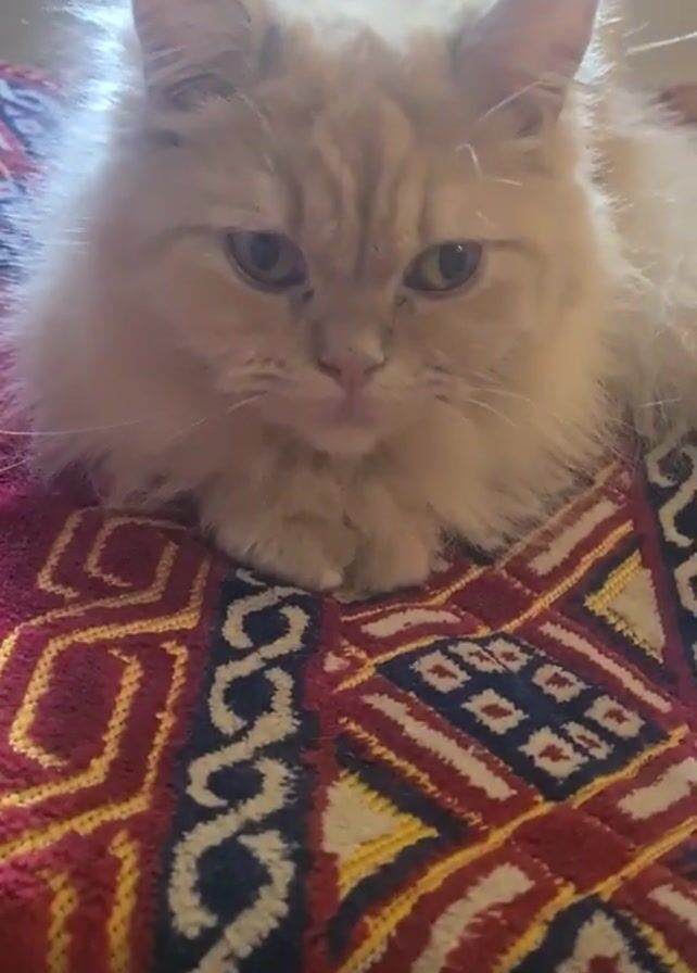 A close-up shows a fluffy, light orange cat lying on a patterned rug