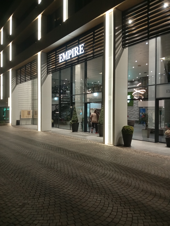 The image displays the illuminated exterior of the "EMPIRE" building entrance at night in Hisarya, Bulgaria