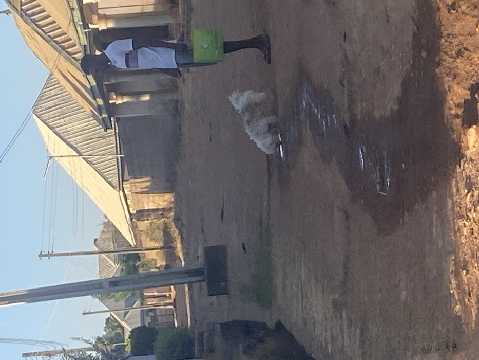 The image depicts an outdoor scene on an unpaved dirt path in a residential area of Bukuru, Nigeria, under clear skies with visible sunlight casting shadows, suggesting morning or late afternoon