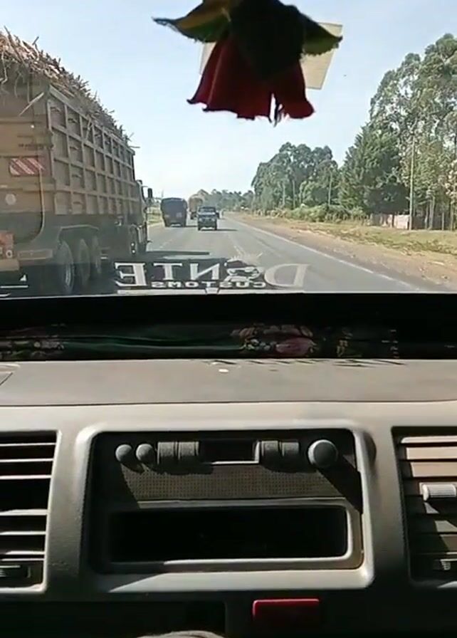 A forward-facing, interior car view captures a road flanked by tall trees and a clear sky. Two large trucks are visible ahead, one carrying a full load of sugar cane. The dashboard is grey and features air vents, knobs, and a storage compartment. A decoration hangs from the rearview mirror. The camera is stationary, providing a stable shot of the road ahead and the passing scenery.