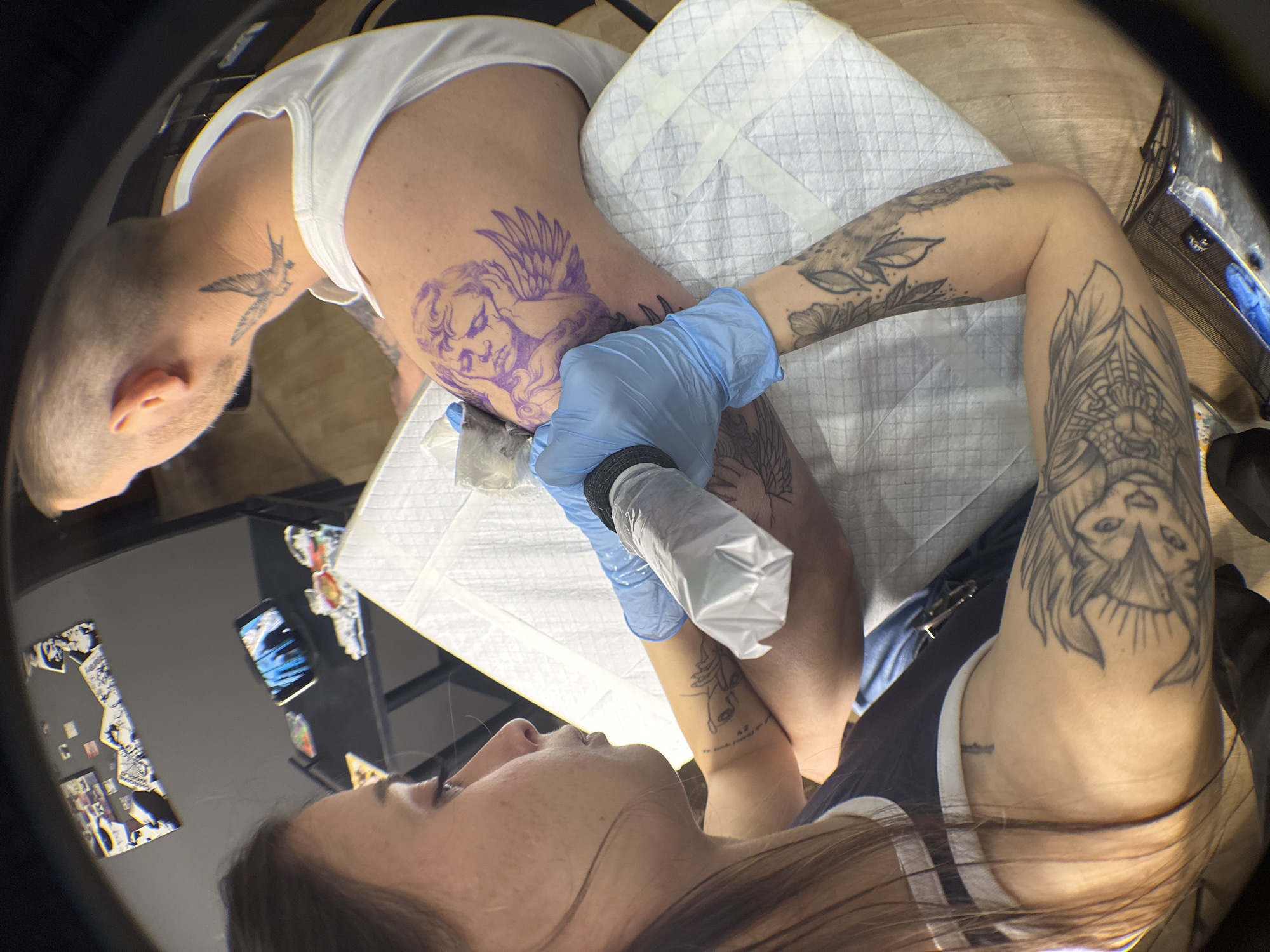 A woman with tattoos on her arms is tattooing a man in a room. The man is lying on his side with a white tank top on, and the tattoo artist is tattooing a cherub onto his upper back. The artist is wearing blue gloves and holding a tattoo machine. The room appears to be a tattoo studio. The location is Saratov, Russia.