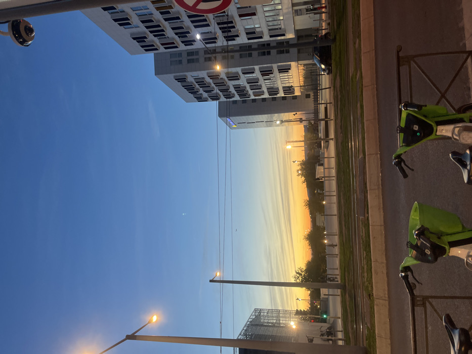 The image depicts an urban streetscape in the Euroméditerranée district of Marseille, France, at dusk or early evening. The sky transitions from deep blue overhead to a vibrant orange and yellow gradient at the western horizon, marked by wispy cloud formations. A single bright celestial object is visible in the upper left quadrant of the sky, and a distant aircraft is present further left. In the immediate foreground, the handlebars and saddles of two green and white Lime electric scooters are partially visible, secured to a dark metal railing. Beyond this, a wide street features two sets of tram tracks embedded in a paved surface, bordered by concrete curbs. Multiple street lamps with illuminated orange light sources are distributed across the scene. Overhead wires, likely for tram power or utilities, traverse horizontally. On the left, a modern building with a reflective, patterned facade is visible, with interior lights activated. A traffic light displaying a green signal is situated further back on the left. The midground includes a landscaped pedestrian area beyond the tram tracks, delineated by numerous light-colored bollards. Sparse trees and shrubs with green foliage are present. Indistinct human figures are visible in this pedestrian zone. On the right, several modern, multi-story buildings with repetitive rectangular window patterns dominate. One building prominently displays a blue and yellow sign, consistent with a hotel brand (e.g., Golden Tulip Marseille Euromed, indicating the specific location near Place Henri Verneuil). A dark-colored compact car is visible on a street further back on the right. A dome-shaped security camera is mounted on a pole in the upper right corner of the frame. A partially obscured red and white circular prohibitory sign is also visible on the far right.