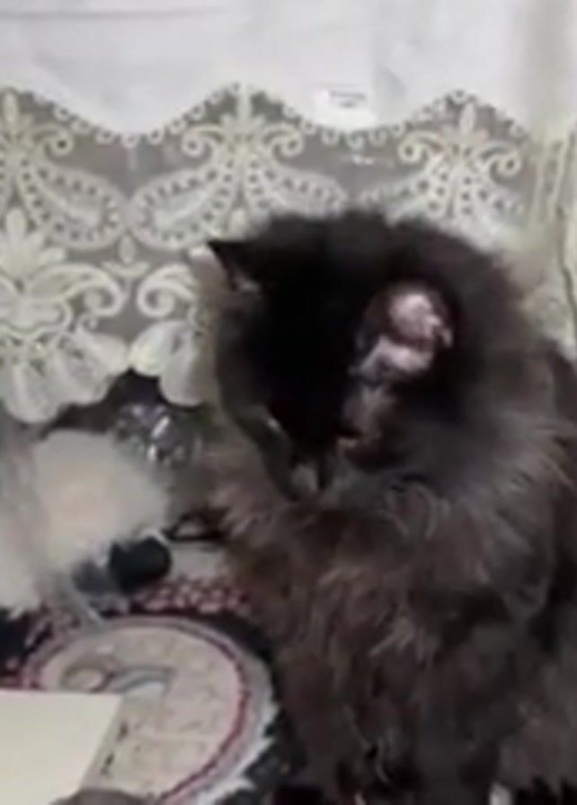 A medium shot shows a black, long-haired cat with golden eyes sitting on a patterned rug