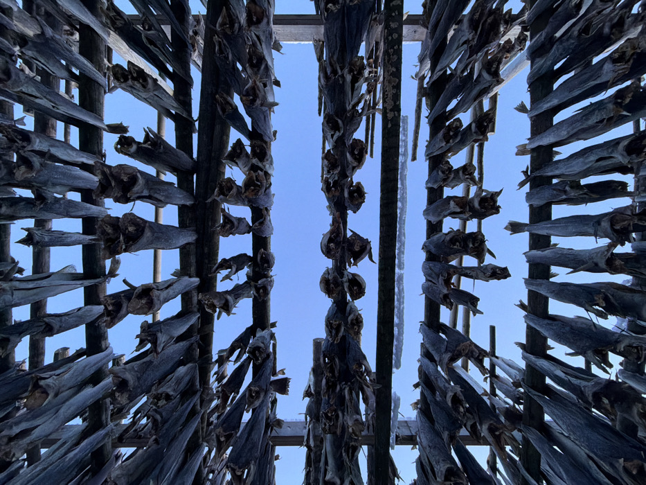 A low-angle shot shows rows of dried fish hanging on wooden racks against a bright blue sky