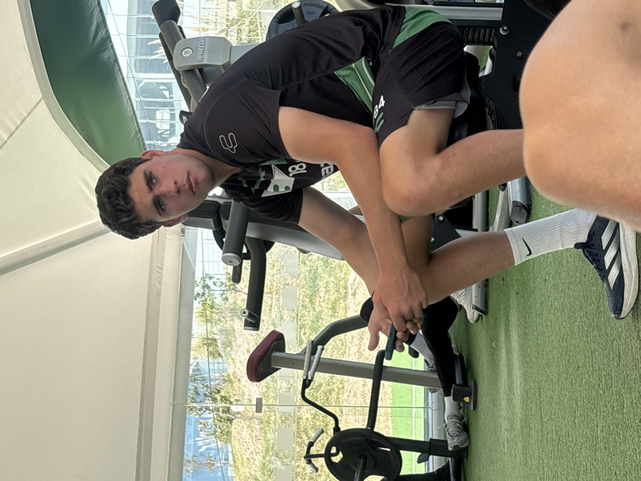A young man wearing athletic gear is seated on a gym machine, leaning forward. He sports a black shirt with green accents and black shorts with "84" visible. The man looks directly at the camera. One foot wears a white sock with a black Nike swoosh and a dark blue Adidas shoe. The gym has large windows, and the equipment is predominantly silver and black. Green flooring completes the space.