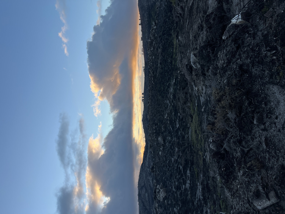 A landscape image shows a dark, craggy rock face on the right, contrasting with a blue sky filled with clouds on the left. The clouds are illuminated with golden hues, suggesting a sunrise or sunset. The sky is partially visible between the clouds. The transition between sky and rock is marked by a distant, uneven horizon. The image is oriented vertically.