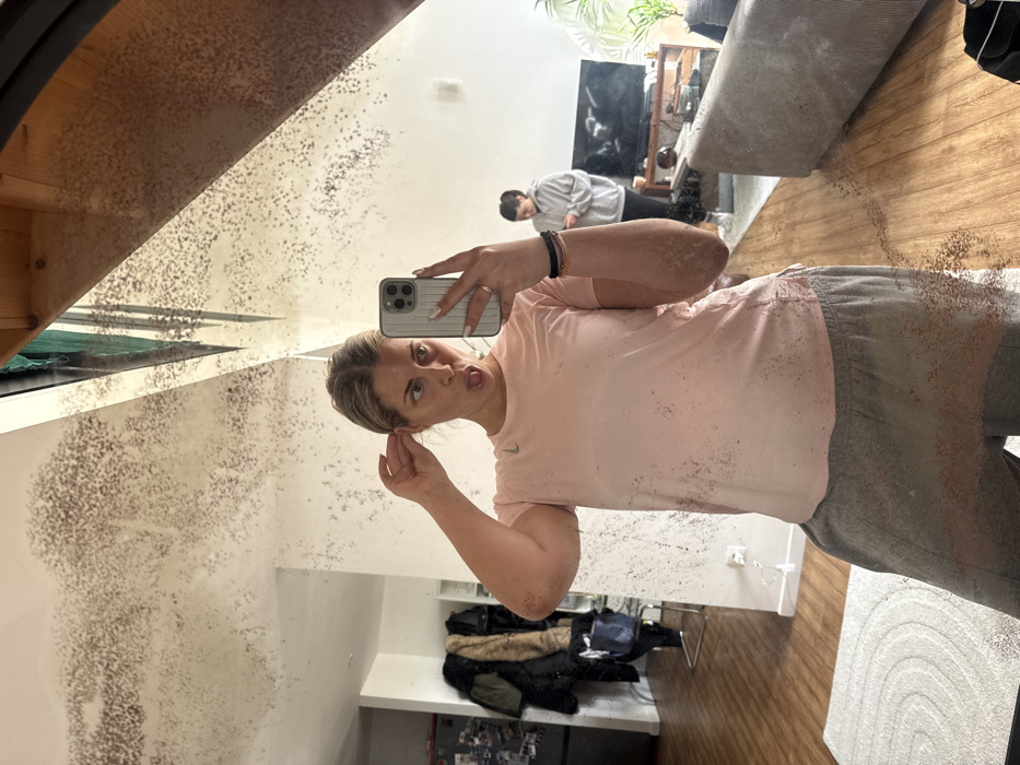 The image depicts a mirror selfie taken inside a residential apartment in Roubaix, France, severely affected by extensive mold growth. A blonde female, approximately 20-30 years old, is the primary subject, captured from the waist up in the mirror's reflection. She wears a light pink short-sleeved athletic shirt with a faint Nike logo and grey sweatpants. Her right hand holds a grey-cased smartphone with a triple-lens camera, positioned to capture the selfie. Her left hand is near her left ear. She is making a playful expression, sticking her tongue out slightly. The most prominent feature of the environment is the widespread dark brown and black fungal growth (mold) covering the reflective surfaces. This mold is visible across the entire mirror, the ceiling, and sections of the walls. Large, irregular patches of mold are particularly dense on the ceiling, especially near a visible wooden beam structure, which might be part of a staircase or an upper-level floor. The mold's presence on the mirror makes it appear as if it is on the subject's clothing and skin in the reflection. In the background reflection, a second female with dark hair is partially visible, standing further back in a living area. She is wearing a light grey hooded sweatshirt and dark pants, appearing to look down at an object in her hands. The living space features light brown wooden flooring, a white circular rug with concentric grey rings, a dark grey sofa, and a television placed on a low wooden cabinet. A tall green plant stands to the right of the television. Further to the left, a coat rack holds several coats, including black, brown, and military green jackets, alongside a blue bag. The apartment appears well-lit, likely by natural light. The overall scene conveys a casual, residential setting significantly compromised by environmental fungal contamination.