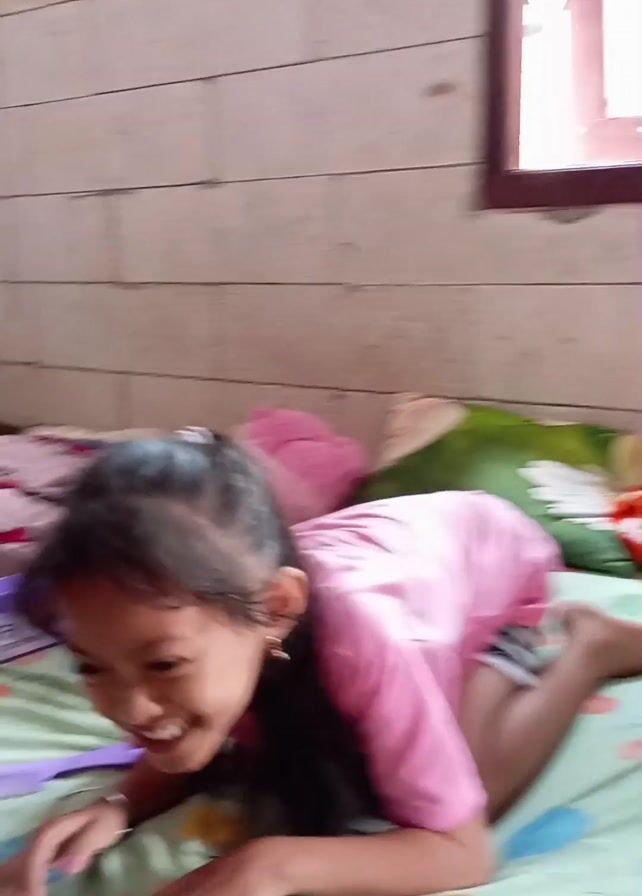 A child in a pink shirt and striped shorts is on a bed in a room with concrete block walls. The child is crawling on the bed, then sits up and smiles, throwing something out the window. She then stands on the bed to close the window. There is a pink stuffed animal, a box of cookies, a comb, and a patterned bedspread on the bed. There is a window with a wooden frame in the background.