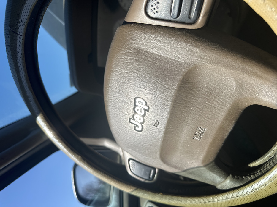 The scene depicts the interior of a vehicle, specified as being in the city of Golyanovtsi, Bulgaria. The primary subject is the brown steering wheel, which is partially covered by a light beige, worn, perforated cover. The central airbag module of the steering wheel features the "Jeep" brand logo prominently, with a small horn icon below it and "SRS AIRBAG" text embossed at the bottom. To the right of the steering wheel hub, a set of dark grey control buttons includes visible labels for "RESUME" and "COAST," indicative of cruise control functions. A partial view of a dark grey control panel is visible on the left side of the hub. Through the vehicle's windshield, a clear blue sky is visible, suggesting an outdoor, daylight environment. The left side mirror is partially visible, reflecting a blurred image consistent with distant trees or foliage. The vehicle's dashboard is visible in the background, appearing to be a consistent brown or tan color. No individuals are visible.