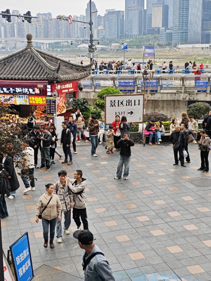 The image depicts a bustling urban scene in Chongqing, China, specifically located in or overlooking the 江北城街道 (Jiangbeicheng Subdistrict). In the foreground, a paved plaza featuring a checkerboard pattern of light gray and tan tiles is populated by approximately 50-70 individuals engaged in various activities, including walking, conversing, observing, and using mobile phones; one man in a black jacket is centrally positioned, holding a phone aloft to photograph. A blue sign on the lower left, partially obscured, displays white Chinese characters indicating "Please do not photograph" and "Tourist Area." To the left, a traditional Chinese-style building with a dark, ornate tiled roof and upturned eaves houses multiple red storefronts with Chinese signage, displaying food items and prices, including "重庆三正宗." A prominent white rectangular sign mounted on a wooden post centrally reads "景区出口 (Scenic Area Exit)" and "EXIT" with a right arrow. Above this level, a concrete bridge with blue railings is heavily trafficked by numerous pedestrians. The background reveals a dense modern cityscape across a body of water, characterized by numerous high-rise residential and commercial skyscrapers under an overcast sky, with additional multi-lane bridges and street infrastructure, including traffic lights, utility poles, and CCTV cameras.