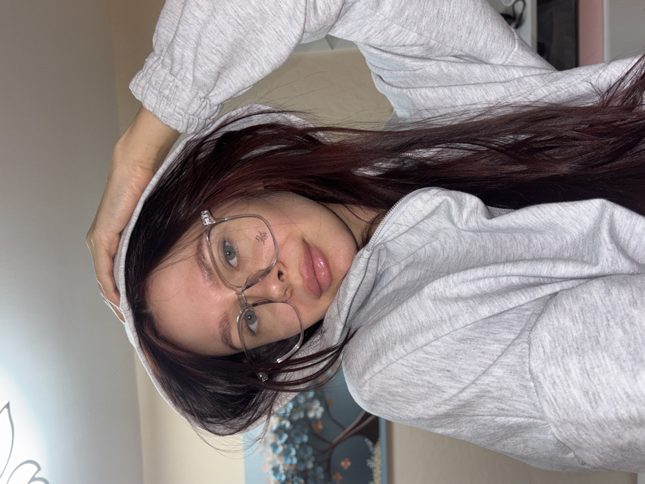 A young female subject is depicted in a close-up, chest-up shot. She has long, dark brown hair with reddish undertones, partially covered by the light gray hood of her zippered sweatshirt. Her right hand is positioned on top of the hood, gently holding it. She wears clear-framed, square-shaped eyeglasses, with a small dark logo visible on the right lens. Her lips are full and appear glossy. Her gaze is directed towards the camera. The background reveals an interior setting, likely a room. To the left, a framed piece of wall art featuring a tree with blue blossoms or leaves is partially visible against a light-colored wall. Further to the right in the background, a subtle reflection or light source is present, and what appears to be a light-colored surface or furniture item is faintly visible. The specific location within Chaikovsky, Russia, is not discernible from the visual information presented.