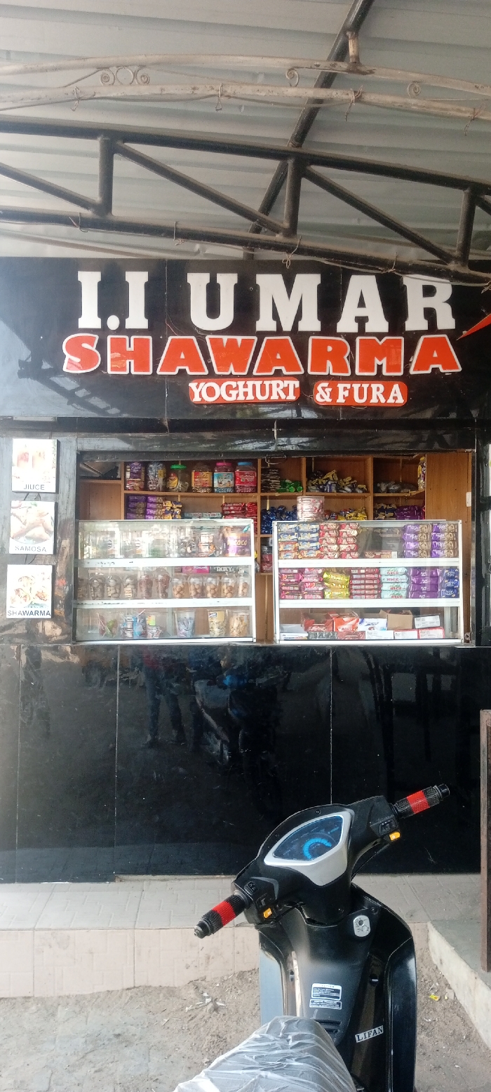 An exterior shot depicts the front of a small commercial food stall named "I.I UMAR SHAWWARMA YOGHURT & FURA" in Sani Mai Nagge, Nigeria. The stall features a prominent black sign with white text "I.I UMAR" and orange text "SHAWWARMA YOGHURT & FURA". Below the sign, a dark, reflective counter extends across the width of the stall. Above the counter, two glass display cases are stocked with various packaged snacks, including biscuits and sweets, along with items in clear plastic containers. Behind these cases, wooden shelves also hold assorted packaged goods. To the immediate left of the main display, three vertical menu boards with images advertise "JUICE", "SAMOSA", and "SHAWARMA". A metal truss framework supports a corrugated metal roof directly above the stall. In the lower foreground, a black Lifan brand scooter/motorcycle is parked, its seat covered with a clear plastic sheet, and red and black grips visible on its handlebars. Reflections of individuals are discernible on the dark, polished surface of the counter. The ground beneath the scooter comprises light-colored paving tiles transitioning to dirt or gravel. The scene is illuminated by natural daylight.