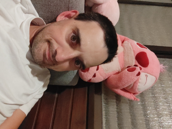 The image presents a close-up, indoor portrait of an adult male. The man, with short dark hair and light stubble on his face, wears a plain white crew-neck t-shirt. He looks directly at the camera with wide eyes and a faint smirk, indicating he is taking a selfie. Positioned behind his head and to his right is a large pink plush toy resembling the character "Angel" from Lilo & Stitch, featuring red spots, closed eyes, and red paw pads. A smaller, light pink plush object is partially visible behind his left shoulder. The man is seated against a grey fabric sofa or chair. To the right of the plush toy, a dark brown wooden furniture piece with horizontal slats is visible. Behind the plush toy, a textured, translucent glass surface, possibly a window or room divider, is present. The environment is an interior room. There are no visual elements within the image to confirm a specific location in Tel Aviv, Israel.